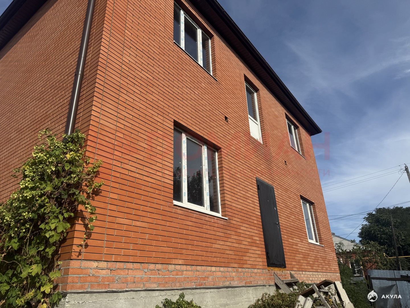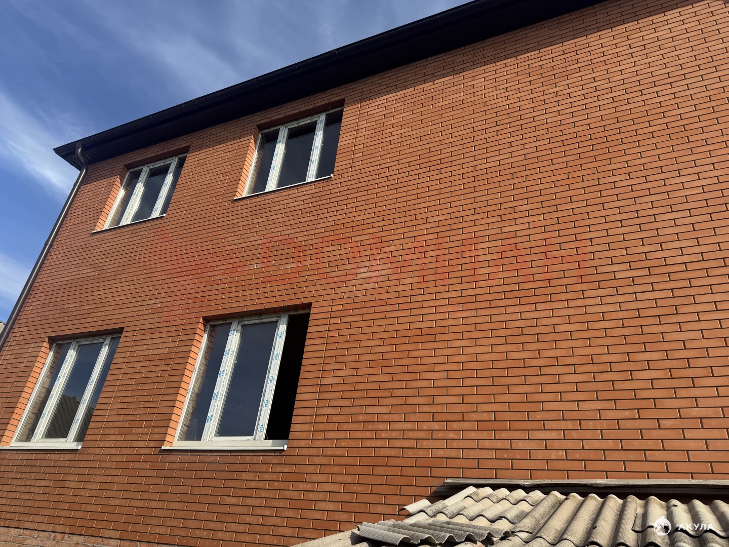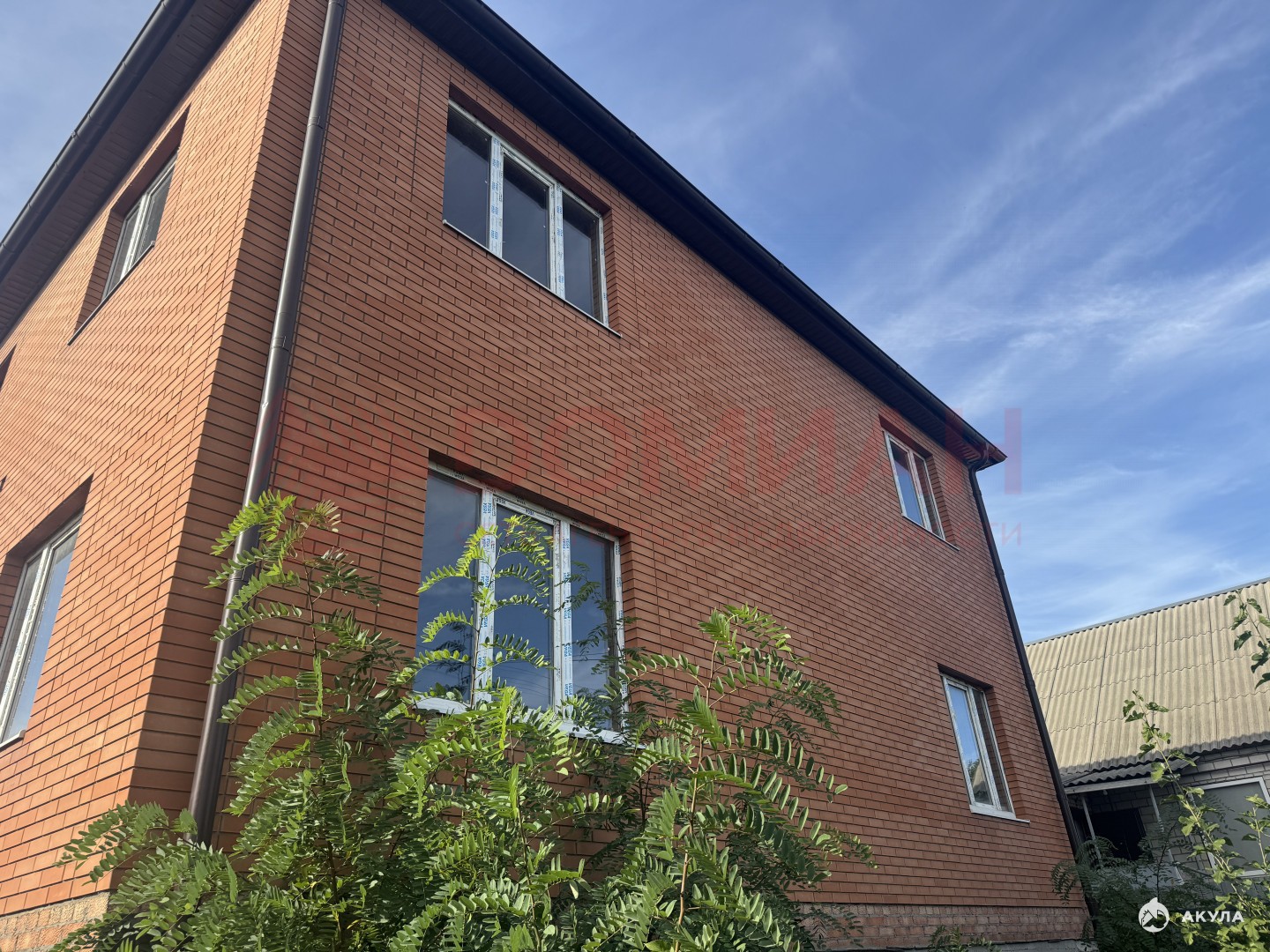 Дом выполнен:ленточный монолитный фундаменткоробка дома из шлакоблокаоблицовка красным кирпичоммежду этажами монолитный поясЖБИ плиты перекрытиявнутренняя перегородка из кирпича монолитная лестницаскатная кровля из металлочерепицыводосточная системаокна металлопластиковыевысота подвала 2.7мвысота этажей 1 этаж - 3.2м, 2 этаж - 2.8мгаз по межецентральное водоснабжениеэлектрика на участкецентральная канализация