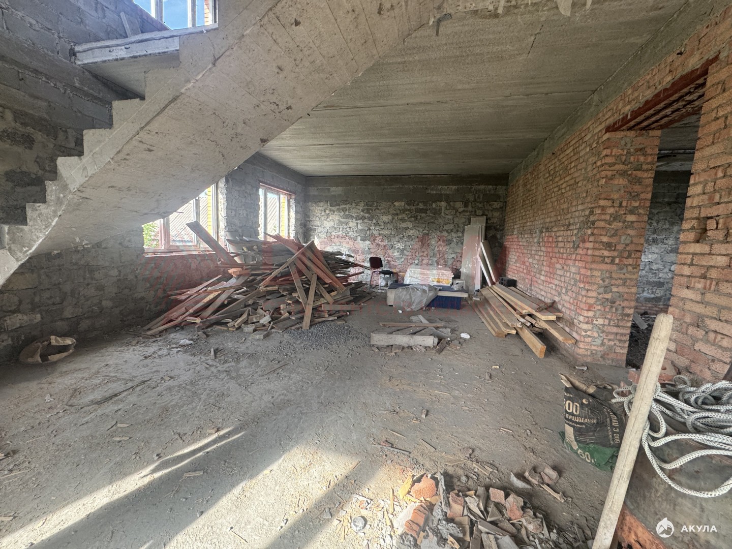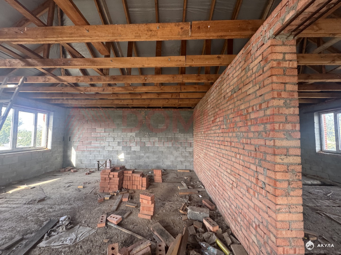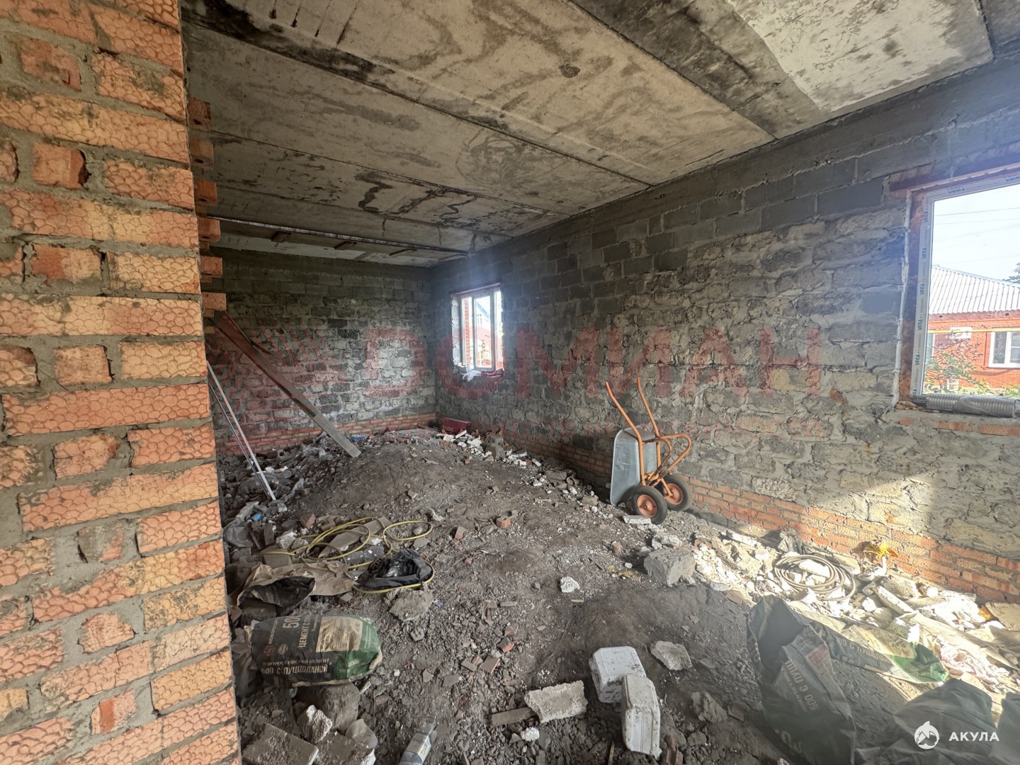 Дом выполнен:ленточный монолитный фундаменткоробка дома из шлакоблокаоблицовка красным кирпичоммежду этажами монолитный поясЖБИ плиты перекрытиявнутренняя перегородка из кирпича монолитная лестницаскатная кровля из металлочерепицыводосточная системаокна металлопластиковыевысота подвала 2.7мвысота этажей 1 этаж - 3.2м, 2 этаж - 2.8мгаз по межецентральное водоснабжениеэлектрика на участкецентральная канализация
