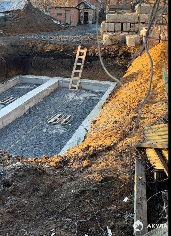 Фасад 19 метров, на участке имеется недостроенный фундамент (строился качественно, для себя), залито 50 кв.м. под цоколь дома, по проекту дом на 100 кв.м.